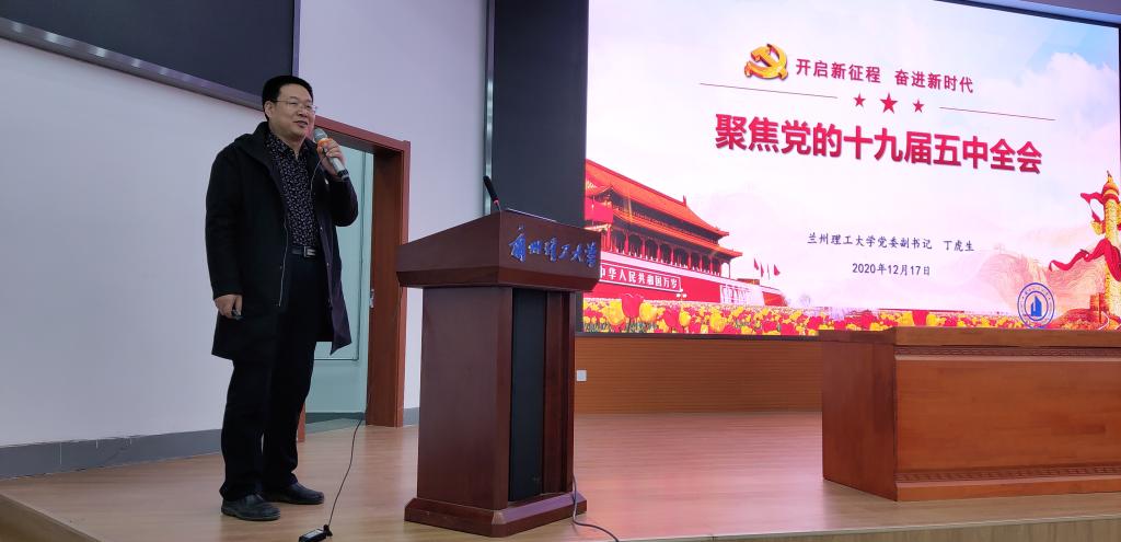 宣誓仪式后,学校党委丁虎生副书记以《开启新征程 奋进新时代》为题,为师生作了党的十九届五中全会精神宣讲报告。报告中,丁虎生副书记围绕“深刻认识进入新发展阶段的重大意义、有利条件和重要特征,准确把握2035年远景目标和“十四五”时期我国发展的指导方针和主要目标,科学把握“十四五”时期经济社会发展的重点任务,牢牢把握构建新发展格局的战略构想和重要着力点,贯彻落实十九届五中全会和习近平总书记对甘肃重要讲话和指示精神,为加快建设幸福美好新甘肃、不断开创富民兴陇新局面而奋斗”等五个方面,系统阐释了习近平总书记在全会上的重要讲话精神和《建议》,联系世情、国情、党情及省情实际,用生动的案例和详实的数据,回顾了全面建成小康社会取得的决定性成就,分析了新发展阶段面临的新形势,阐释了“十四五”规划和二〇三五年远景目标的主要内容,对全会提出的进入新发展阶段、贯彻新发展理念、构建新发展格局等一系列重大部署作了系统解读。