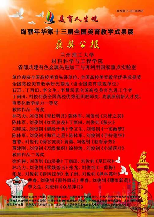 由中国教育学会、中国高等教育学会美育专业委员会等多单位联合举办的第十三届全国美育教学成果展,于2020年12月初落下帷幕。m88help center联合国家重点实验室以《材料之美》为载体组织申报了第十三届美育教育成果展,经全国美育教学成果展评组委会评审,报送的多项作品喜获佳绩。m88help center获“全国高校美育先进单位”、“全国高校美育教学优秀成果奖”、“全国高校美育教学研究基地(含全国美育联盟单位)”。石玗、丁雨田、李文生、李慧获“全国高校美育先进工作者”,丁雨田、刘俊钊获“全国高校优秀组织教师奖”、“高素质创新人才奖”、“审美化教学能力一等奖”十名教师获“教师作品一等奖”,八名教师获“教师作品二等奖”。