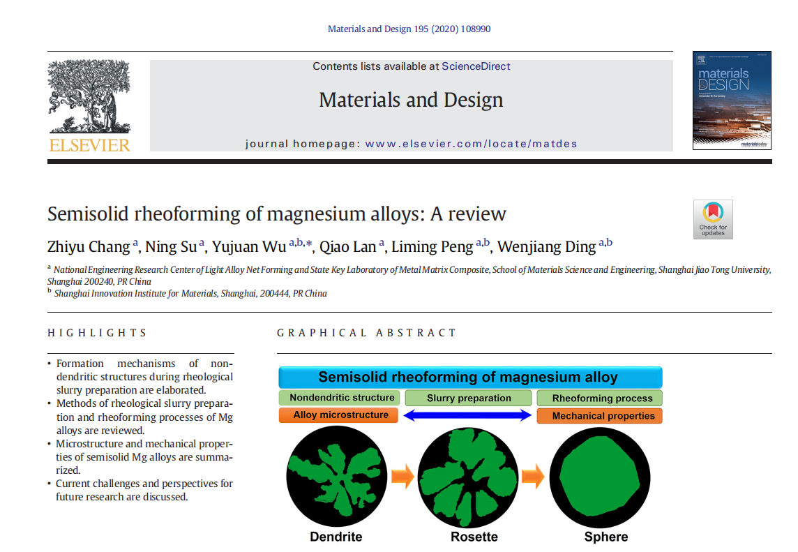 近日,国际著名杂志《Materials and Design》2020年10月即将出版第195卷在线发表“Semisolid rheoforming of magnesium alloys: A review”(https://doi.org/10.1016/j.matdes.2020. 108990)综述文章,对我院李元东教授团队提出的镁合金半固态制浆技术----“自孕育法”进行了全面评述。