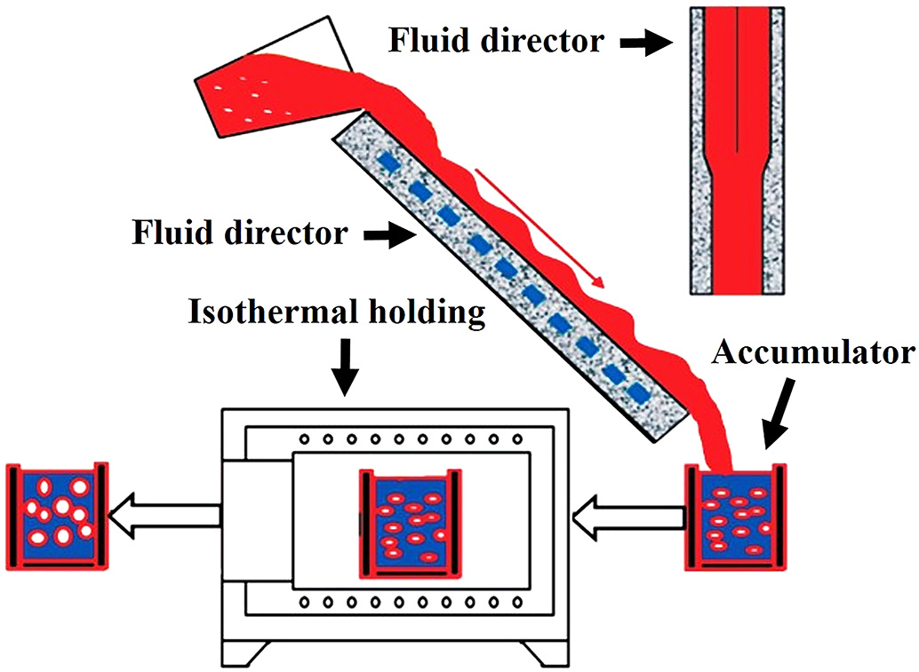 自孕育法的过程包括三个主要阶段。首先,准备合金熔体并将其调整到所需的温度。其次,将自孕育剂加入合金熔体中,快速搅拌。为避免污染料浆成分,自孕育剂通常是与合金熔体成分相同的金属颗粒或金属块。最后,将混合的熔体倒入带有多流混合冷却通道的流体导流器中。