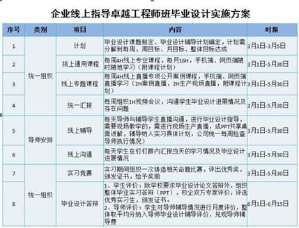 方案中毕业设计题目由企业导师确定,题目都是从企业生产的实际工程问题中提炼而来。将毕业设计任务以周为单位划分成为每周的毕业设计任务。毕业设计周期内,每天企业导师与辅导学生直播沟通,进行毕业设计指导,通过现场生产直播,或PPT共享桌面讲解,进行企业生产实践教学;每周组织1小时视频会议,沟通学生毕业设计进展情况及存在问题,企业将汇总问题并统一解决。