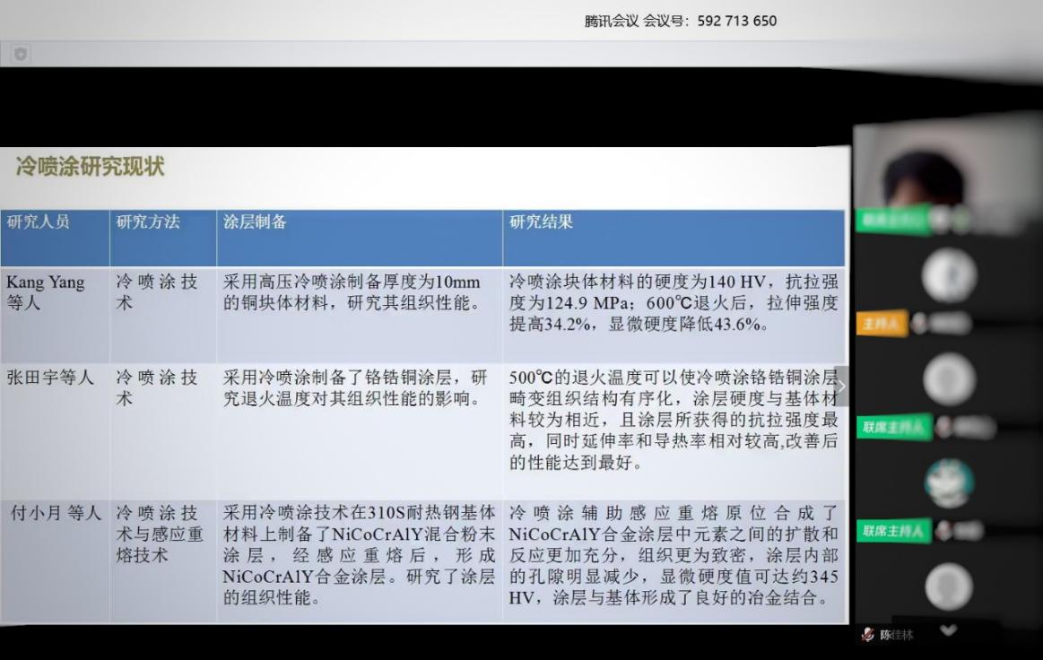 本次论坛邀请了省部共建有色金属先进加工与再利用国家重点实验室教师黄国威和2017级硕士研究生李洞亭同学,报告主题分别为《高熵合金用于质子交换膜燃料电池不锈钢双极板表面改性研究》和《低压冷喷涂铜基材料组织性能的研究》。m88help center2019级硕士研究生积极踊跃地参加了本次线上学术论坛。