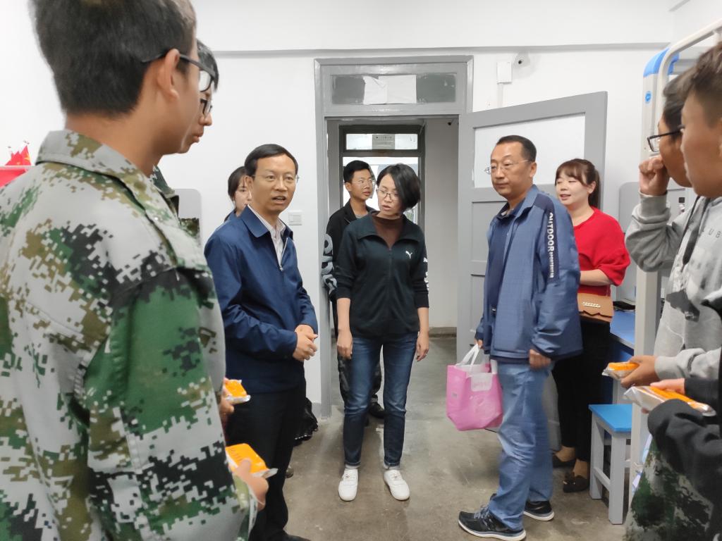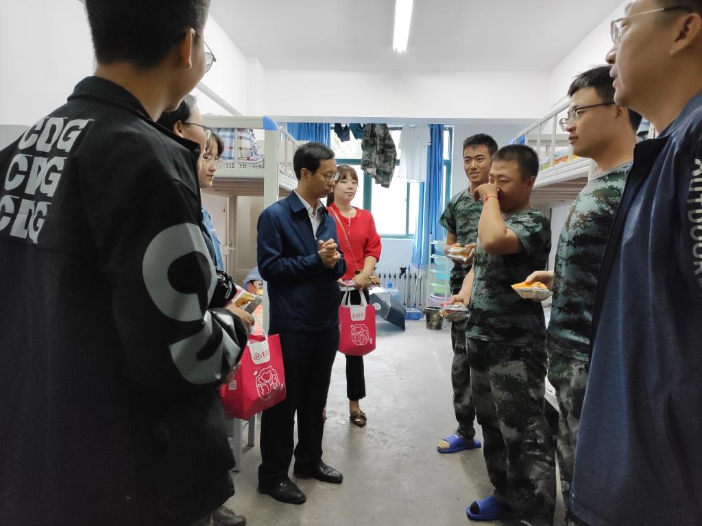9月12日中午,在中秋佳节即将来临之际,m88help center党委书记李元东、副书记王祎敏以及2019级辅导员老师走访学生宿舍,看望慰问新生,为同学们送去了节日的祝福。