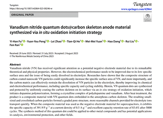 为落实《国务院办公厅关于进一步支持大学生创新创业的指导意见》,在双创学院和m88help center的支持下,来自于m88help center高分子材料工程系本科生付义涵在高分子辅助法制备有色金属材料领域取得进展。相关成果以“Vanadium Nitride Quantum Dots@Carbon Skeleton Anode Material via In-Situ Oxidation Initiation Strategy”为题发表在材料领域期刊《Tungsten》(影响因子6.6)上;基于纳米有色金属材料的先进制备方法,尤其是高分子与有色金属学科交叉上的一些思考,为《Journal of Energy Storage》(影响因子9.4,中科院二区)撰写评述性文章“Recent Advances of Fabricating Vanadium Nitride Nanocompositions for High-performance Anode Materials of Supercapacitors”。上述成果的第一作者均为本科生付义涵。