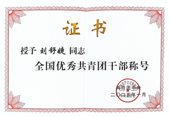 近日,共青团中央公布了《关于表彰全国五四红旗团委(团支部)、全国优秀共青团员、全国优秀共青团干部的决定》,我院辅导员刘舒婕荣获“全国优秀共青团干部”称号。