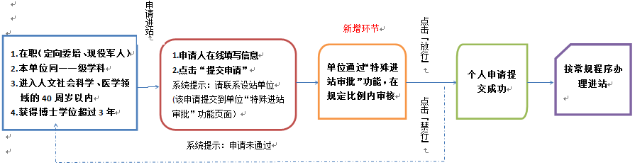 4、经设站单位同意即可进站的事项包括:(1)比例内招收在职人员(含定向委培、现役军人)、本单位同一一级学科人员、进入人文社会科学、医学领域的40周岁以内人员;(2)获得博士学位超过3年的人员。