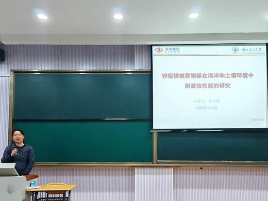 随后,张文娟老师以《锌铝镁镀层钢板在海洋和土壤环境中耐腐蚀性能的研究》为题,分享了她的研究成果。张老师围绕海洋和土壤环境下金属防护这一热点话题,系统介绍了锌铝镁镀层的特性,并结合大量实验结果,分析了其在复杂海洋和土壤环境中的耐腐蚀性能。她的研究成果为解决海洋和土壤工程中金属材料的腐蚀难题提供了新的思路和方法,引发了师生们对于锌铝镁镀层材料应用前景的热烈讨论。