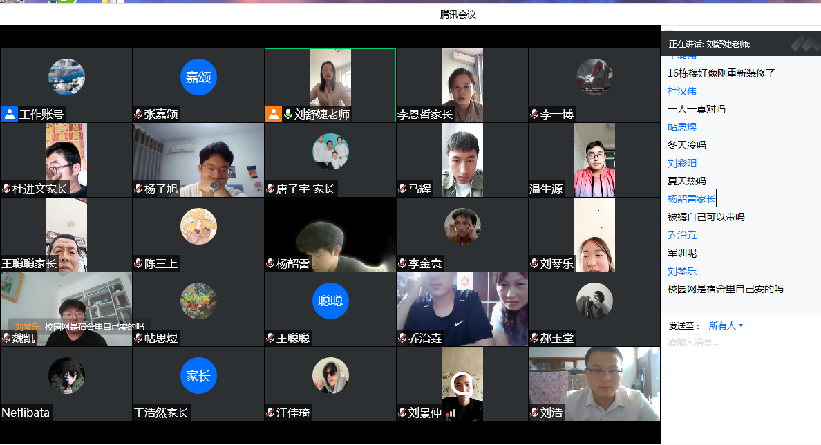 会上,各新生班主任与新生及家长进行云端相见,按照学院拟定的内容提纲,为新生及家长讲清学校相关政策及管理规定、答疑解惑,在开学之初充分做好家校联络相关工作。通过学院宣传片、专业师资简介、近年就业考研数据等内容让学生及家长对学院有更直观的了解。学院统一组织各位经验丰富的辅导员老师担任新生班主任,各位老师为家长及学生细心讲解学校学籍管理、学生管理、奖助补贷等相关政策规定,为同学们讲明大学学习生活的底线与高线,通过学生成长规律、学校教育目标、个人工作经验等要点为新生做好大学学习生活规划,梳理新生短期重点任务,教育引导每位同学树立远大目标,争先创优、开拓进取。通过开学第一课入学教育,积极引导新生积极配合学校筑牢织密疫情防线,每天认真、如实完成大学小帮手的健康打卡任务;自觉自律参与线上学习,积极乐观面对大学生涯,尽快适应并顺利完成中学向大学的过渡。