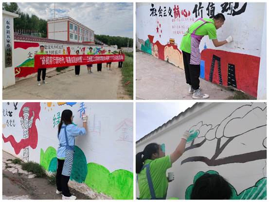 践行青春“普”写乡创暑期社会实践队来到东乡族自治县五家乡马场村,通过墙绘进行乡村生态环境美化,用画笔为铸牢中华民族共同体意识、助力乡村振兴贡献自己的青春力量。墙绘活动以“奋楫前行新时代,笔墨点亮乡村情”为主题,内容生动融合,扮靓乡村“高颜值”,助推新时代“文化强”。