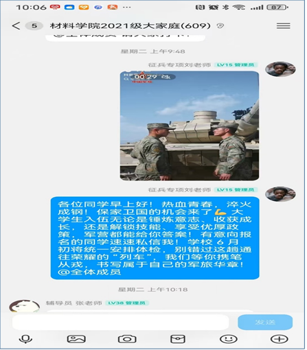 学院充分利用年级管理群,打造 “24 小时在线征兵服务站”。定期推送精心制作的征兵政策解读、入伍流程指南、军营生活剪影等图文、视频资料,确保学生在征兵各阶段随时获取最新资讯,实现宣传服务全天候在线。