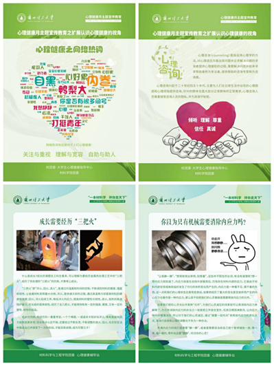 广泛开展心理健康宣传。学院承办了学校心理健康中心第十八届525心理健康月知识展,通过宣传栏海报展示和网络公众号推送向同学们介绍了心理健康节、心理健康常识、大学生心理特点、心理压力的一般调节方法等内容,进行宣传和普及;除此之外,学院团委和心理健康辅导站还利用工科专业知识来开展心理育人工作,制作了以“一本材料学,伴你走天下”为主题的宣传海报,借助工科知识背景来加强宣传,启发学生从专业知识中获取心理建设的智慧和力量,加强育人成效。