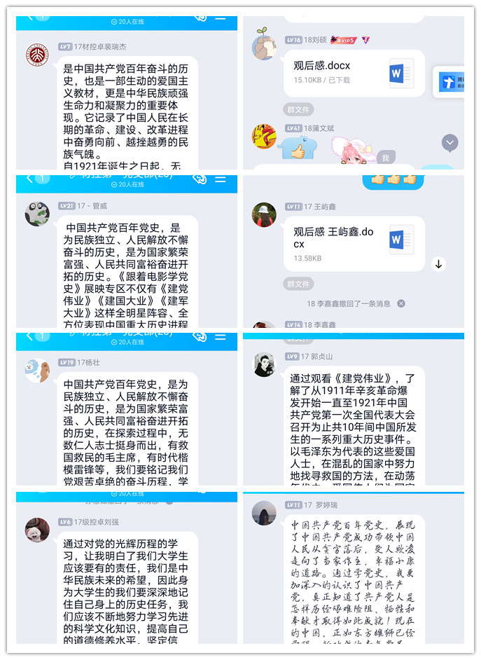 在支部组织的线上交流活动中,各位党员就自己观影体会进行深入交流,通过本次 “跟着电影学党史”活动,各位党员同志更加深入地认识了中国共产党,在建党百年之际,重温历史,通过电影的形式了解中国共产党的历史,中国共产党百年党史,展现了中国共产党成功带领中国人民从贫穷落后,受人欺凌走向了当家作主,幸福小康的道路。通过学党史,各位党员同志真正知道了共产党人是怎样历经艰难险阻、牺牲和奉献才取得如此成就!现在的中国,正如东方雄狮已经觉醒,新时代的青年党员,更应时刻警醒自己,不断提高,争取为国家的进步奉献自己的一份力。
