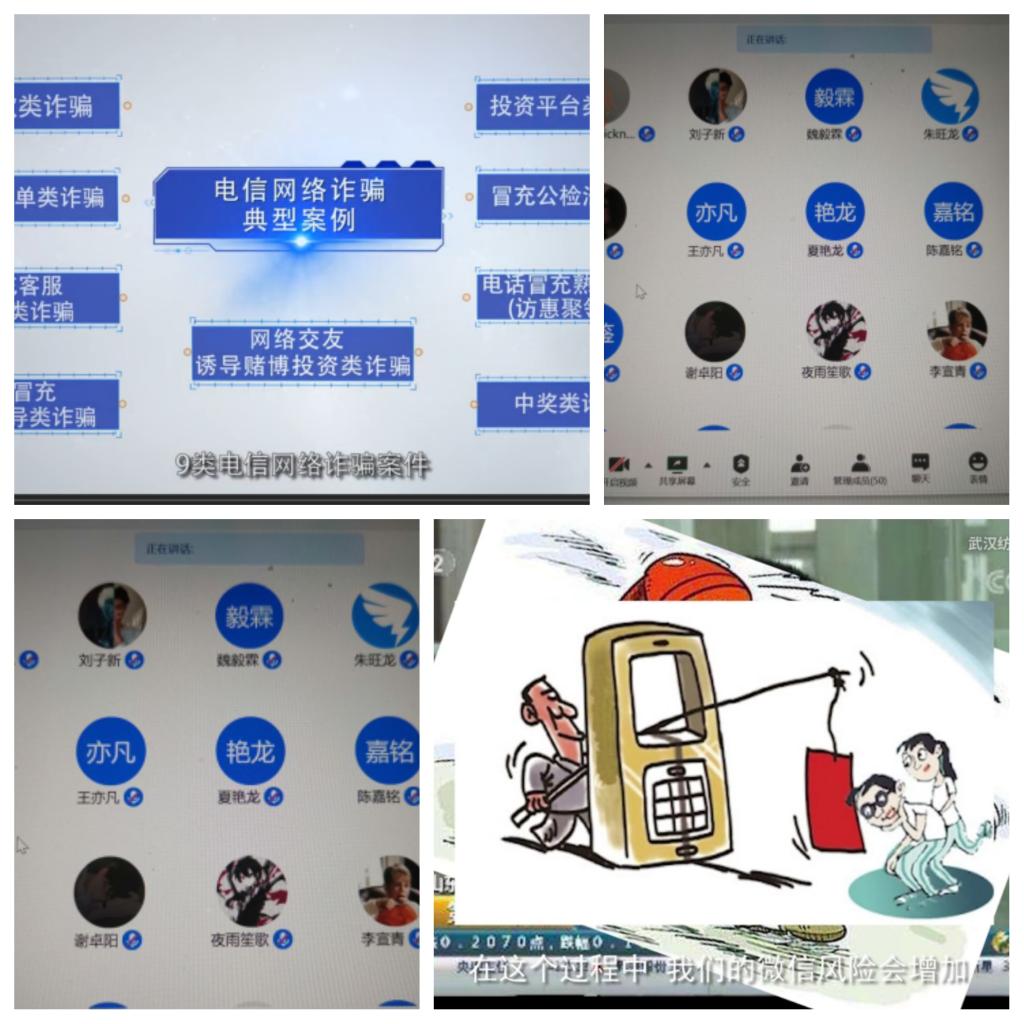 焊接技术与工程基地班、材料成型及控制工程卓越班及一班通过线上主题班会的形式带领班级同学学习了多种预防电信诈骗的方法:1、积极参加学校组织的安全教育活动,多了解、多掌握防范知识;2、在日常生活中提高防范意识,做到不贪图便宜、不谋取私利,不轻信花言巧语,不把自己的个人信息等情况随便告诉陌生人等;3、交友要谨慎,避免以感情代替理智;4、自觉遵守校纪校规,抵制网络刷单、预防电信诈骗。