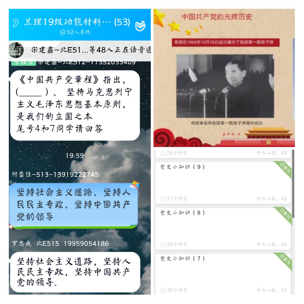 “青春战疫 并肩同行”为主题的实践团日活动,让同学们积极投身防控志愿服务,帮助身边的人,做向上向善好青年;“传承五四精神 坚定制度自信”为主题的学习经典团日活动,同学们传颂、手抄五四经典励志诗篇;“我为团旗争光彩”为主题的手绘团旗、与团旗合影团日活动,殷红的团旗、明亮的团徽映照青年心中;“永远跟党走”为主题的学习习近平总书记重要论述团日活动,选取总书记对青年拳拳期望寄语,摘抄品读、学习感悟;“知识点亮未来”为主题的知识分享团日活动,网课过程中的难点请学霸给大家解惑;“电影唤起红色记忆”为主题的线上红色教育观影团日活动,同学们充分发表观后感悟,坚定爱国信念;“我爱我家-防疫卫生活动”为主题的清扫家庭、勤做家务团日活动,倾注青年对家庭的温情与热爱。