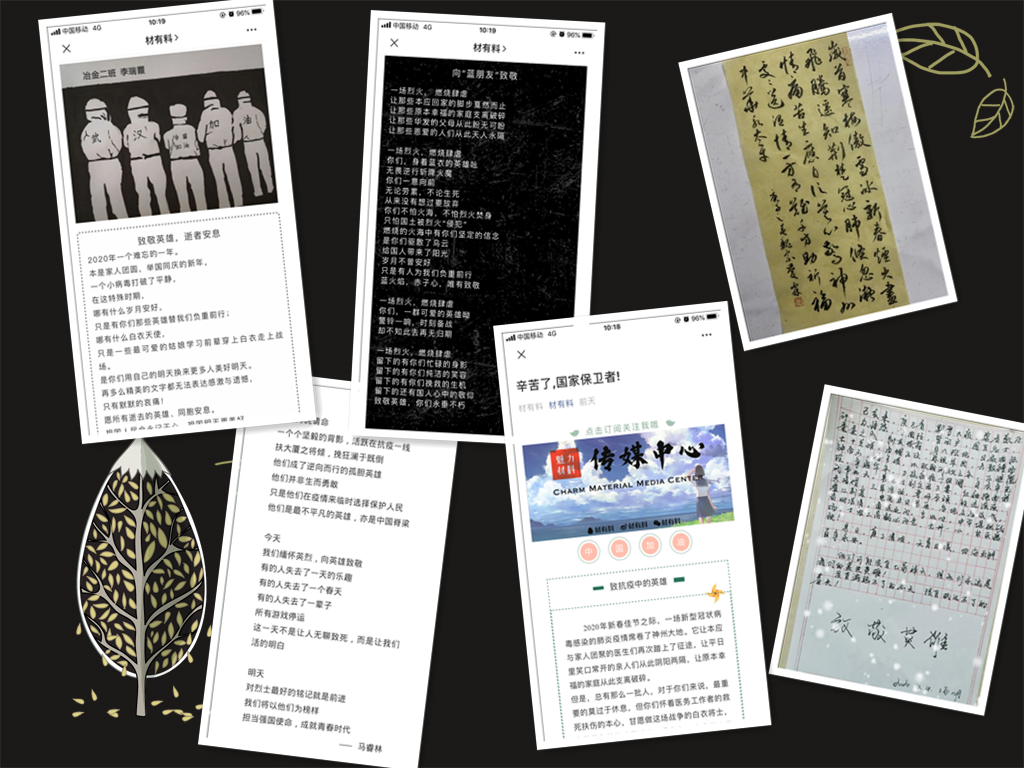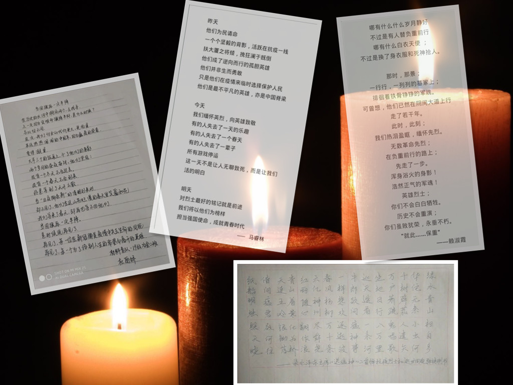 清明假期期间,m88help center青年志愿者服务大队自发组织了“云端寄哀思 手书致英灵”清明悼念活动,志愿者们通过原创诗歌、散文,手抄报等多种形式深刻地表达了对抗疫英烈及逝去同胞的敬意与哀悼,在学院自媒体平台中广泛宣传,引领广大青年缅怀、学习,主动担负时代重任。“说星星很亮的人,是没有见过白衣天使的眼睛”在李旭玟笔下,白衣天使是那样的高尚纯洁;“昨天,他们为民请命,一个个坚毅的背影,活跃在抗疫一线,扶大厦之将倾,挽狂澜于既倒”在马睿林看来,他们又是那样勇敢坚毅;“别忘了因疫情殉职的刘院长,他的遗孀追着灵车痛哭;别忘了遗体捐国的肖贤友,弥留之际却无法见到心上人;别忘了李文亮…”在王俊儒眼里,这些牺牲的英雄,值得每一个人民牢牢铭记,值得印刻在中华民族的历史长河中。面对疫情大考,我院志愿者中许多“00”后站了出来,充分展现青年担当。在家乡的抗疫工作中做事发声,为当地贡献自己的光和热;不能身赴前线的同学踊跃捐献自己的爱心,每一位同学都在用自己最纯真的方式,表达着最深厚的怀念以及最崇高的敬意。