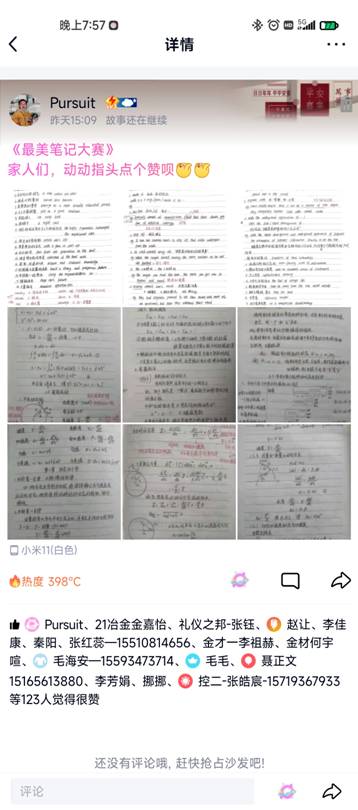 活动一经发出,全院学子积极响应,纷纷晒出了独属于自己的“网课最美笔记”。20年级的田江霞同学在个人社交平台晒出自己的《材料科学基础》笔记,字迹清秀有“古墨轻磨满几香,砚池新浴灿生光”的意味,内容充实且整齐让人一目了然;21级田有娣同学说清晰的笔记不仅可以在上完课之后重新复习一遍所学的内容,还可以帮助她从书上繁杂的文字中解脱出来,她的《大学物理》笔记,利用图注的方式进行知识点的梳理和总结,独树一帜。还有许许多多优秀的同学也积极分享出了自己的课堂笔记,百花齐放展示出了在各个学科获得的累累硕果,是全体同学学习的榜样。