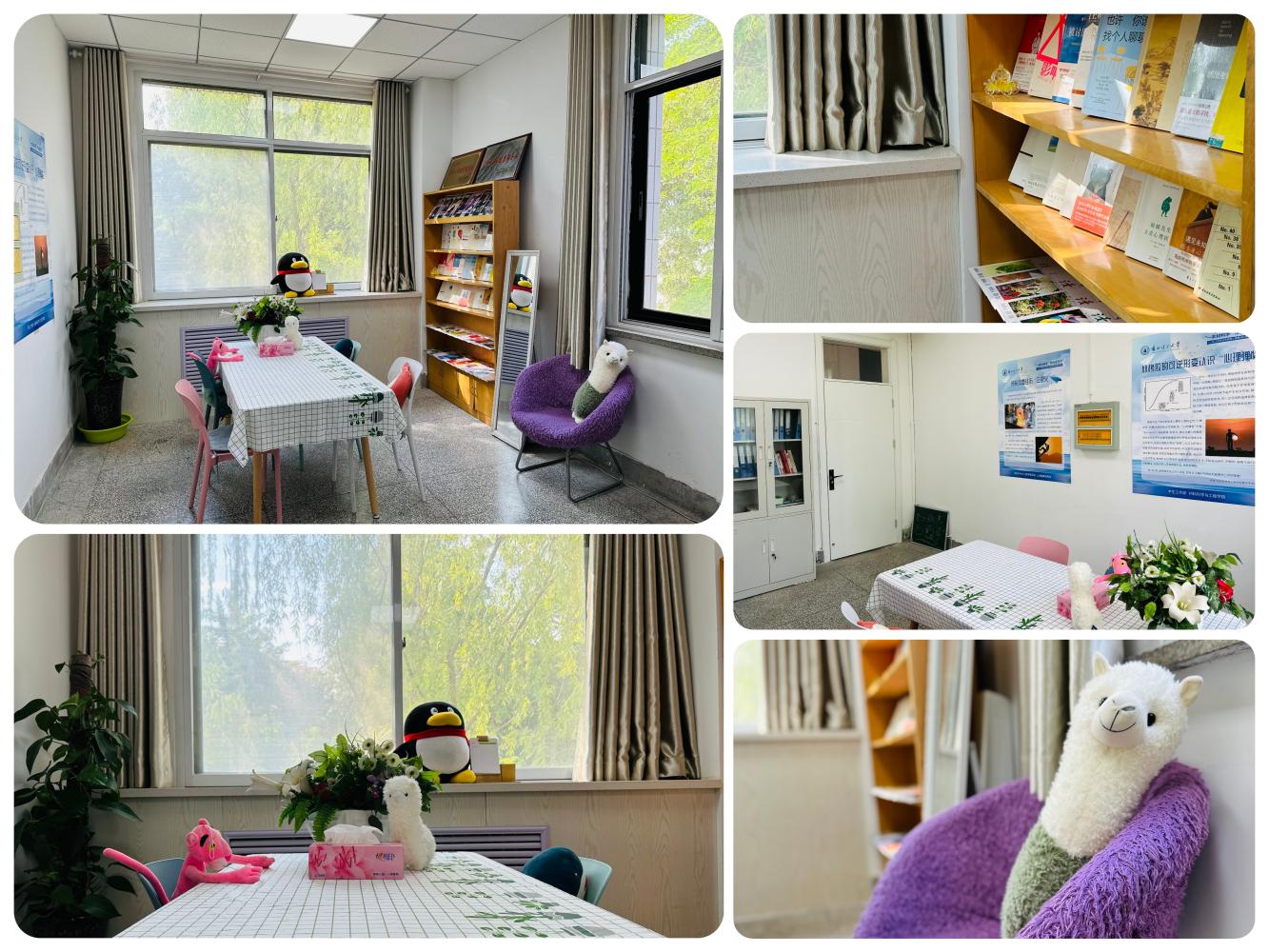 新的心理健康辅导站改变了原有模式,突出轻松活泼的氛围,房间内设有会谈区、阅读区、测评区、资料保管区几个功能模块;房间中会谈桌椅的布置以清新、简洁的颜色为主,同时摆放有学生们喜欢的也是适于解压的毛绒类玩偶,还配有了绿植、纸巾,为谈话过程的进行创设了良好的环境;窗边书架上陈列有心理健康类杂志、心理科普类书籍,以供师生借阅使用,旨在用书籍传播心理健康的科学观念和常识;保管资料的资料柜按照要求配备加锁设置,能够对会谈等记录做好保密。在硬件设施上心理健康辅导站也能够独立作为会谈室使用,满足心理健康服务工作的同时也能兼顾例行工作的需要。