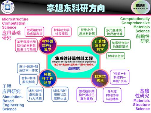 李旭东教授的“科研实践”始终瞄准国际上“虚拟工程”的发展趋势,主攻“集成性计算材料工程”(Integrated Computational Materials Engineering,ICME)领域,包括“材料结构学”、“材料微结构计算学”、“模拟性工程科学”和“计算性综合材料学”四大科研方向,坚持以目标为导向,以实战为引领,以材料“五要素模型”为理论依据,以实践“材料科学-材料工程-材料服役”一体化技术为目标,以“数字化-数值化-虚拟化-可视化-集成化”为技术基石,立足于“数字技术”、“虚拟现实”和有限元解析,为“材料仿真实践”进一步拓展和完善以材料微观组织结构为中心、以工程应用为根本的“理论体系-研究方法-技术基础-仿真能力”,进而在自主定义的“材料空间”和“服役空间”内,运用“虚拟现实”技术、自主编程和“计算机辅助+……”方法构建拟实性“材料模型→制造模型→服役模型”和“工程模型”**。在此基础上,沿着(1)“材料基因”在“材料空间”内的传递路径、或者/以及(2)“虚拟材料”在“服役空间”内的行为路径,采用“九空间分析法”,进行基于ICME的“虚拟工程”***研究,重点开发“共性技术、预测性技术、平台化技术”,更加有效地践行“响应快、周期短、风险小、成本低、可持续”的装备研制要求,朝着实现材料“全形貌表征→全状态设计→全工艺仿真→全流程模拟→全性能计算→全寿命预测”为标志的“虚拟认证”这一愿景而不懈努力,不断提升以材料“表征-设计-预测-服役-制造-认证”技术一体化为内涵的“虚拟工程”能力,更好地服务于“产业数字化”!