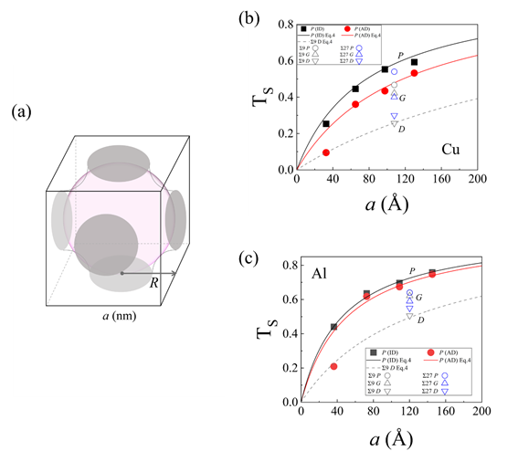 随着纳米材料在航空航天、电子器件和能源存储等领域的广泛应用,纳米晶体的热稳定性问题成为材料科学研究的热点之一。特别是对于极小尺寸纳米金属材料,晶界的迁移和晶粒的长大是影响其性能稳定性的关键因素。针对面心立方金属铜和铝中Schwarz晶体的热稳定性问题,可持续材料设计与模拟研究团队与中国科学院金属研究所联合开展研究并取得重要进展。研究发现,Schwarz晶体的热稳定性与其晶界形状、晶界间距以及晶界能量的各向同性程度密切相关;在此基础上,研究团队提出了一种热力学模型,可成功描述纳米尺度下Schwarz晶体热稳定性的尺寸依赖性,为纳米金属微观结构设计和性能优化提供了新的理论依据。该模型不仅适用于面心立方金属,还可推广到其他晶体结构的金属和合金中。