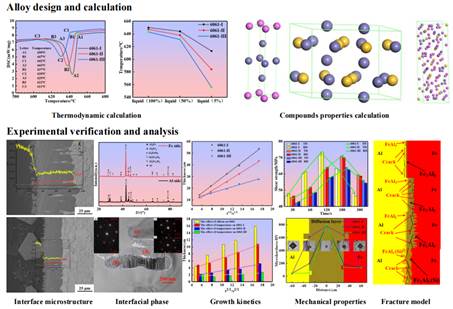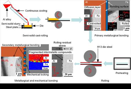 在国家自然科学基金支持下,研究团队针对铝/钢复合板界面脆性金属间化合物导致的结合强度低、协同变形能力差等难题,提出了一种半固态流变铸轧技术制备铝/钢复合板的方法,融合了半固态浇铸轧制与流变浇铸轧制两大先进工艺。通过铝合金中硅元素含量、钢侧表面状态、复合板体轧制工艺调控铝/钢复合板的界面组织、结合方式、力学性能,创新性地构建了界面冶金结合与机械互锁复合强化的多尺度优化框架,开创了高性能铝/钢复合材料制备的新范式,成功应用于6061铝合金/Q235钢复合板的制备,为复合材料的深加工和应用提供了借鉴和理论支撑。